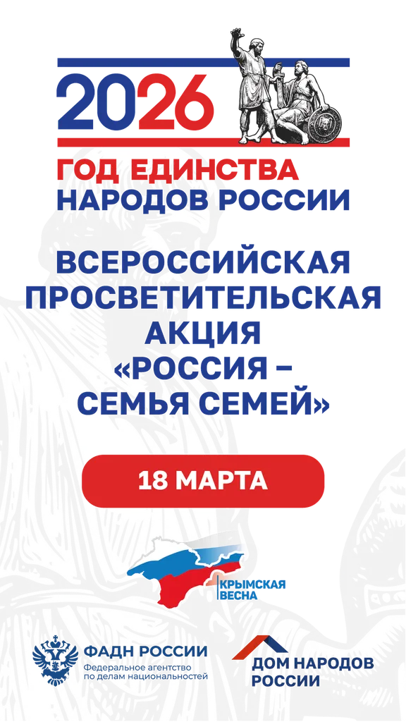 Всероссийская просветительская акция «Россия — семья семей» приурочена к Году единства народов России, объявленному в соответствии с Указом Президента РФ от 25 декабря 2025 года №962.